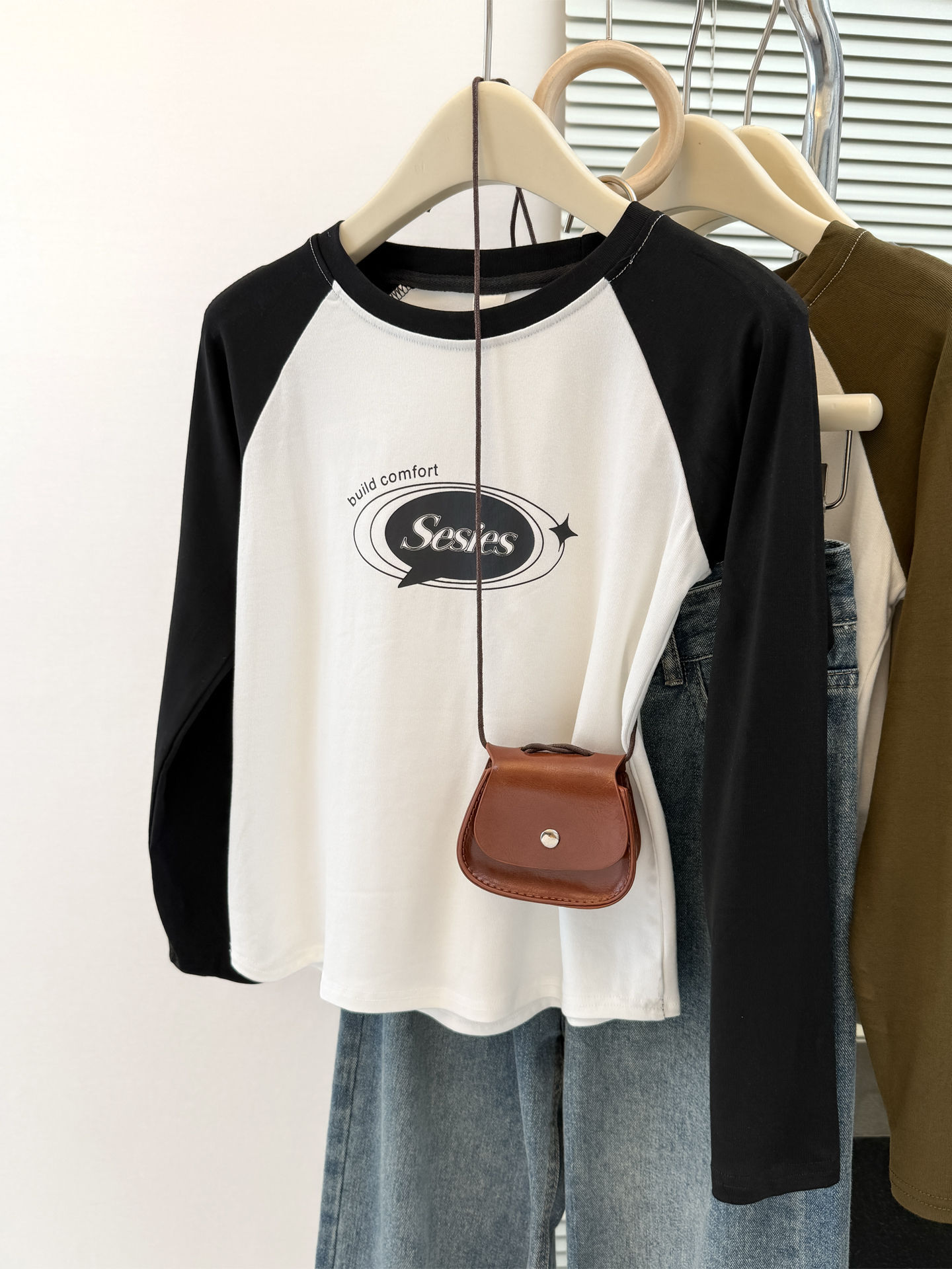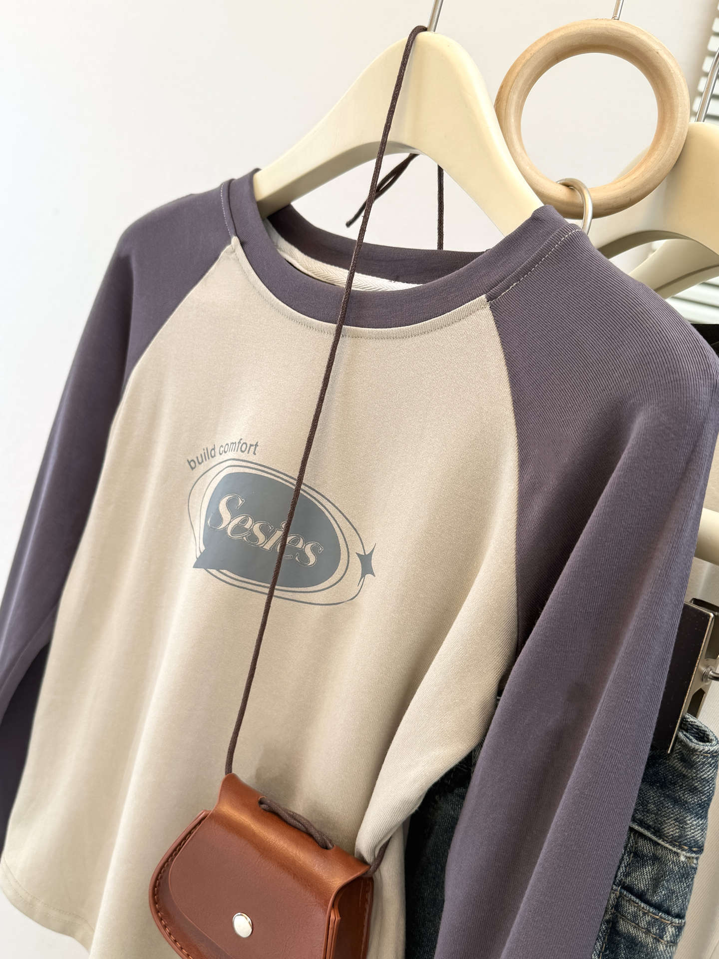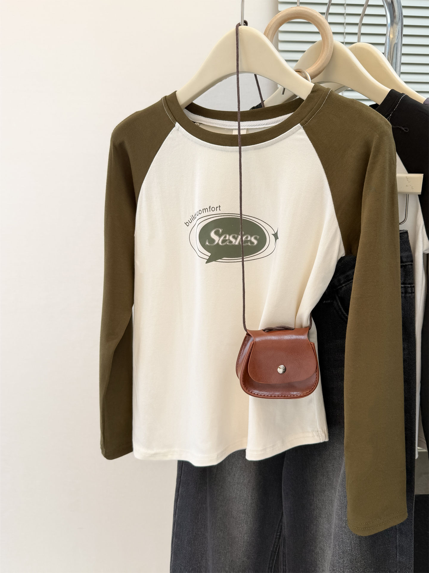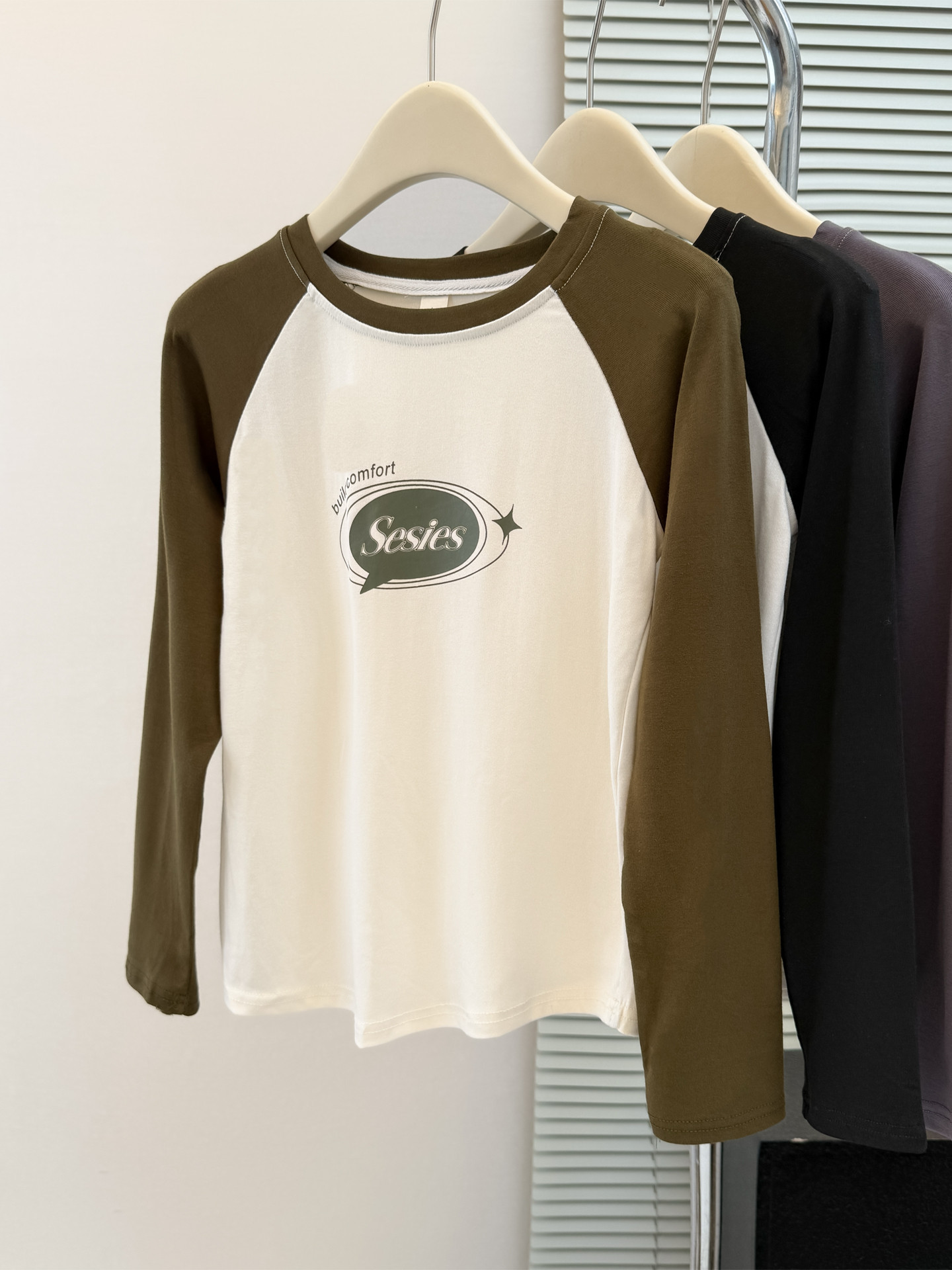 style new color-blocked long sleeve T-shirt for womenearly autumn and spring slim fit short top raglan sleeve