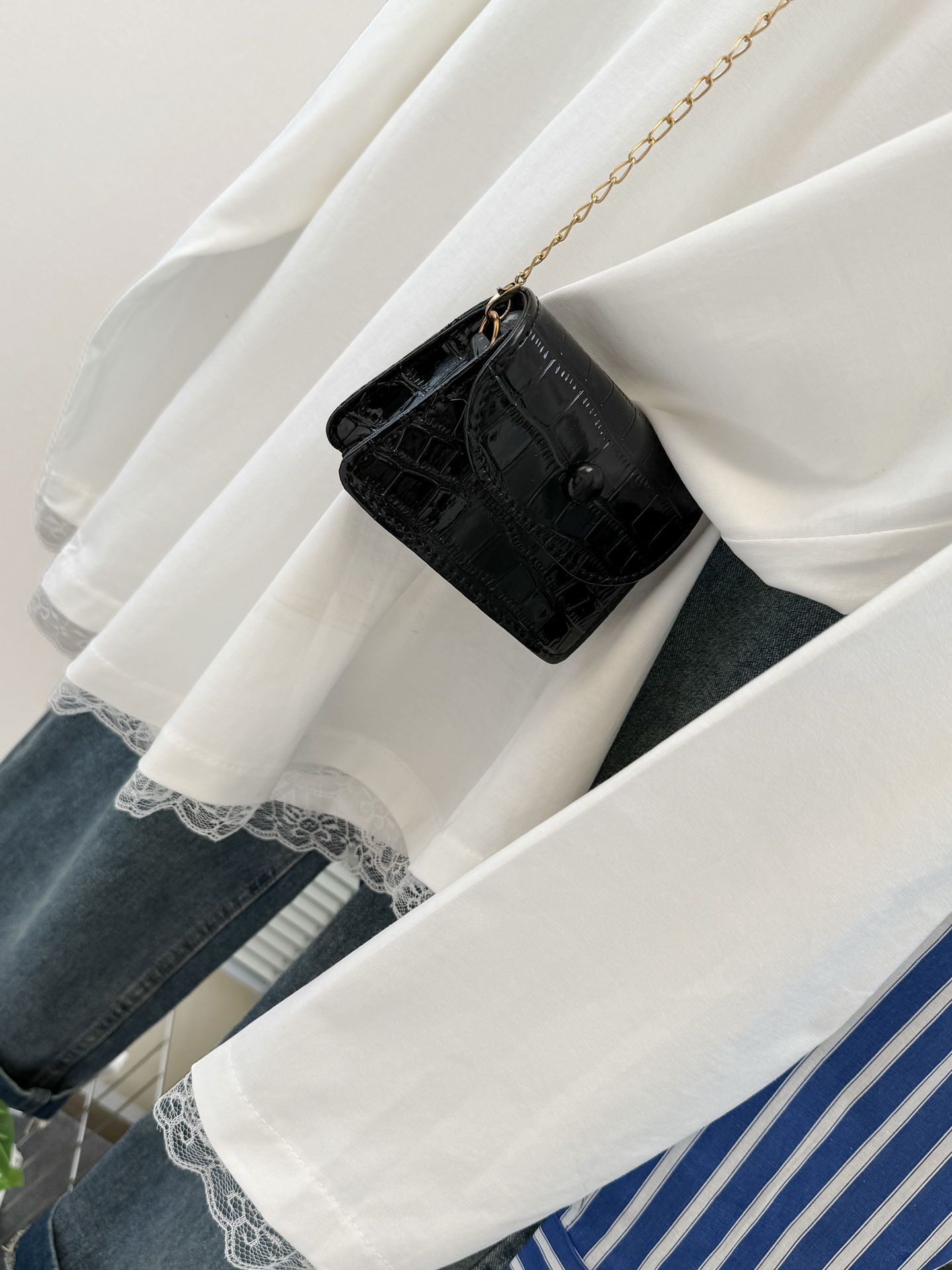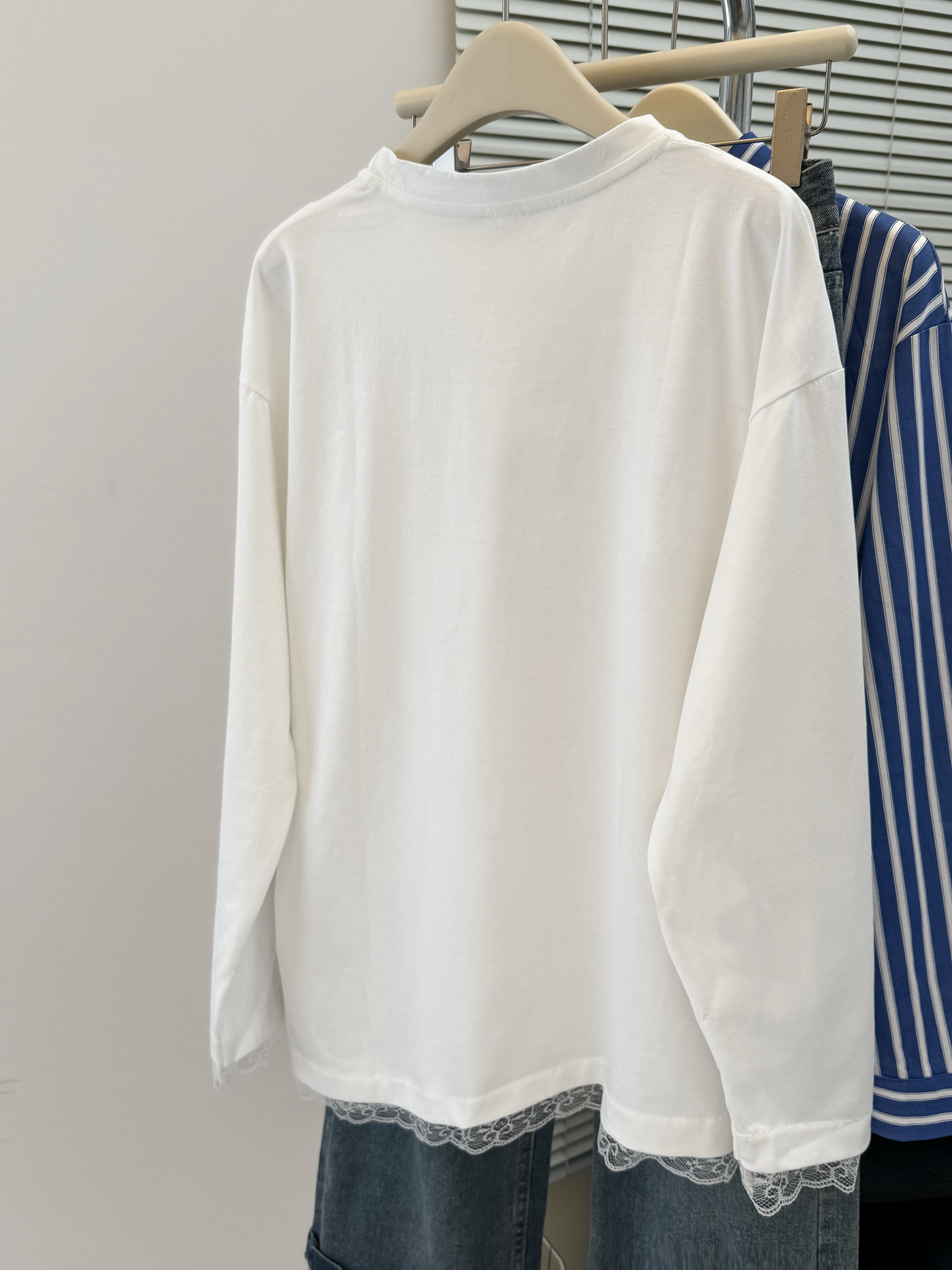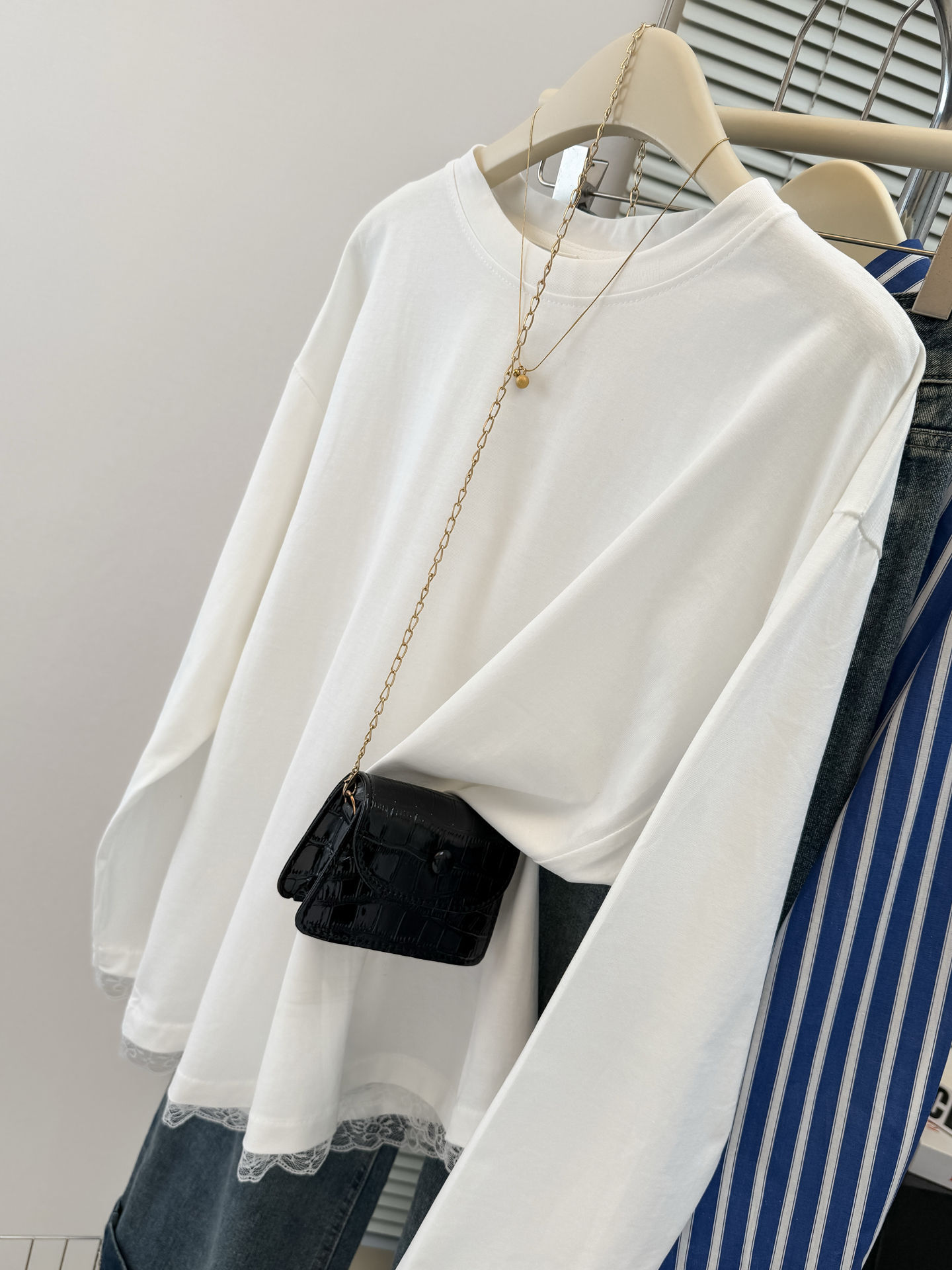 Style Real Shot White Lace Trimmed Long Sleeve T-Shirt Women Early Spring Autumn Loose Korean Style Innerwear Top